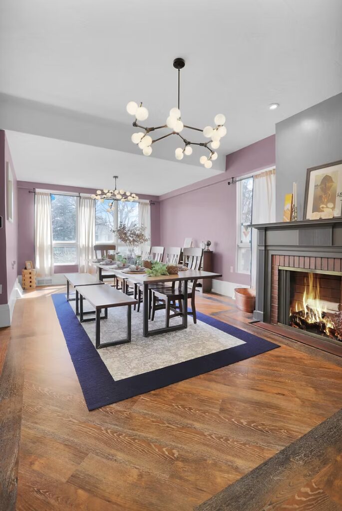 Once subdivided by previous owners, this space was opened back up to become one of the home’s most dramatic and elegant rooms. The bold smoky plum walls, original fireplace, and layered lighting create a moody but welcoming space perfect for gathering.